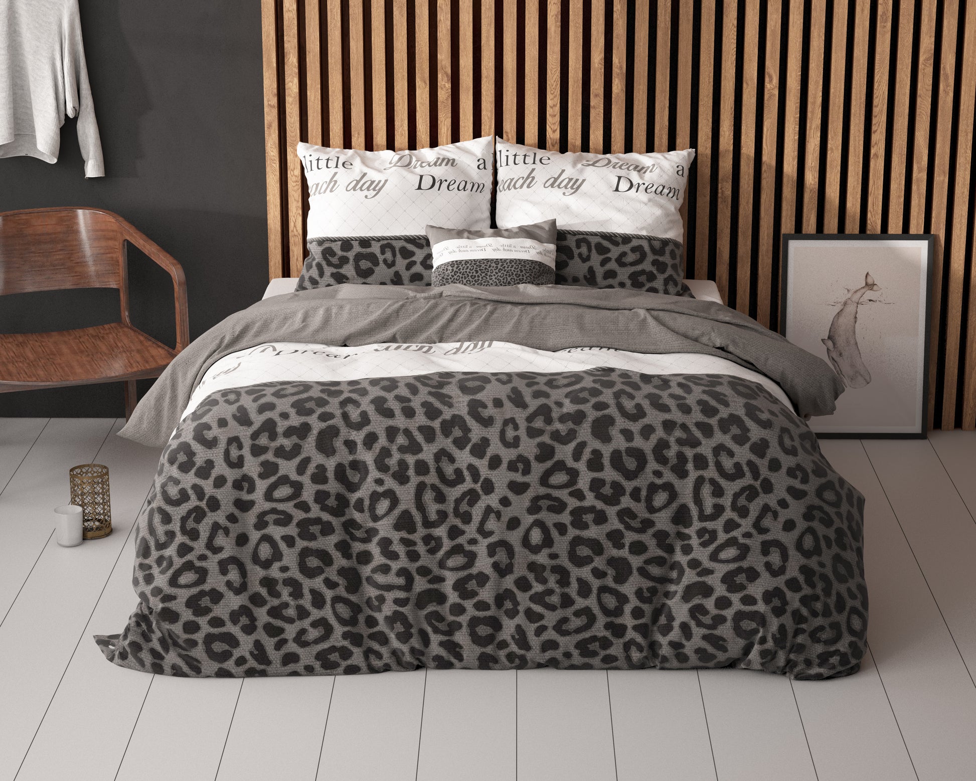 Kruip elke avond weer heerlijk weg onder dit trendy en comfortabele Sleeptime Elegance Dream and Sleep-dekbedovertrek. Dit overtrek heeft aan een zijde een stoere gewaagde panterprint en een effen dessin aan de andere zijde. Daarnaast staan ook woorden zoals ‘Dream, sleep’ en zo erop afgebeeld. Het dessin vind je terug in de kussenslopen. Combineer de dierenprint met een effen hoeslaken in de kleur wit, grijs of zwart om het plaatje compleet te maken! Dit dekbedovertrek heeft een totale lengte van 220 cm en sluit met de handige drukknopen het dekbed af.
