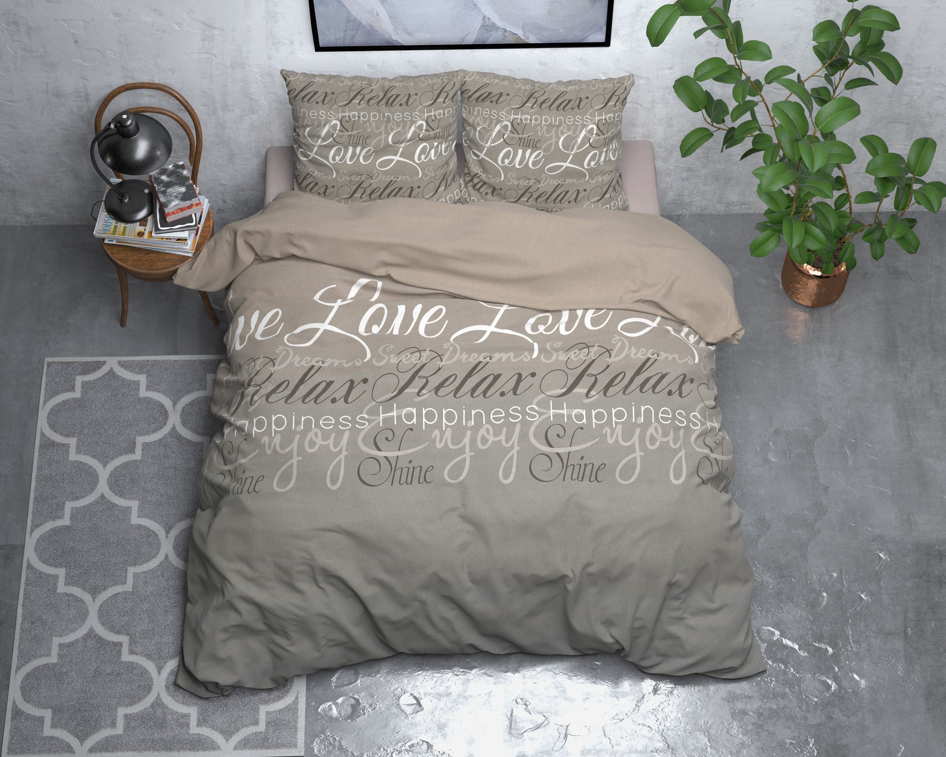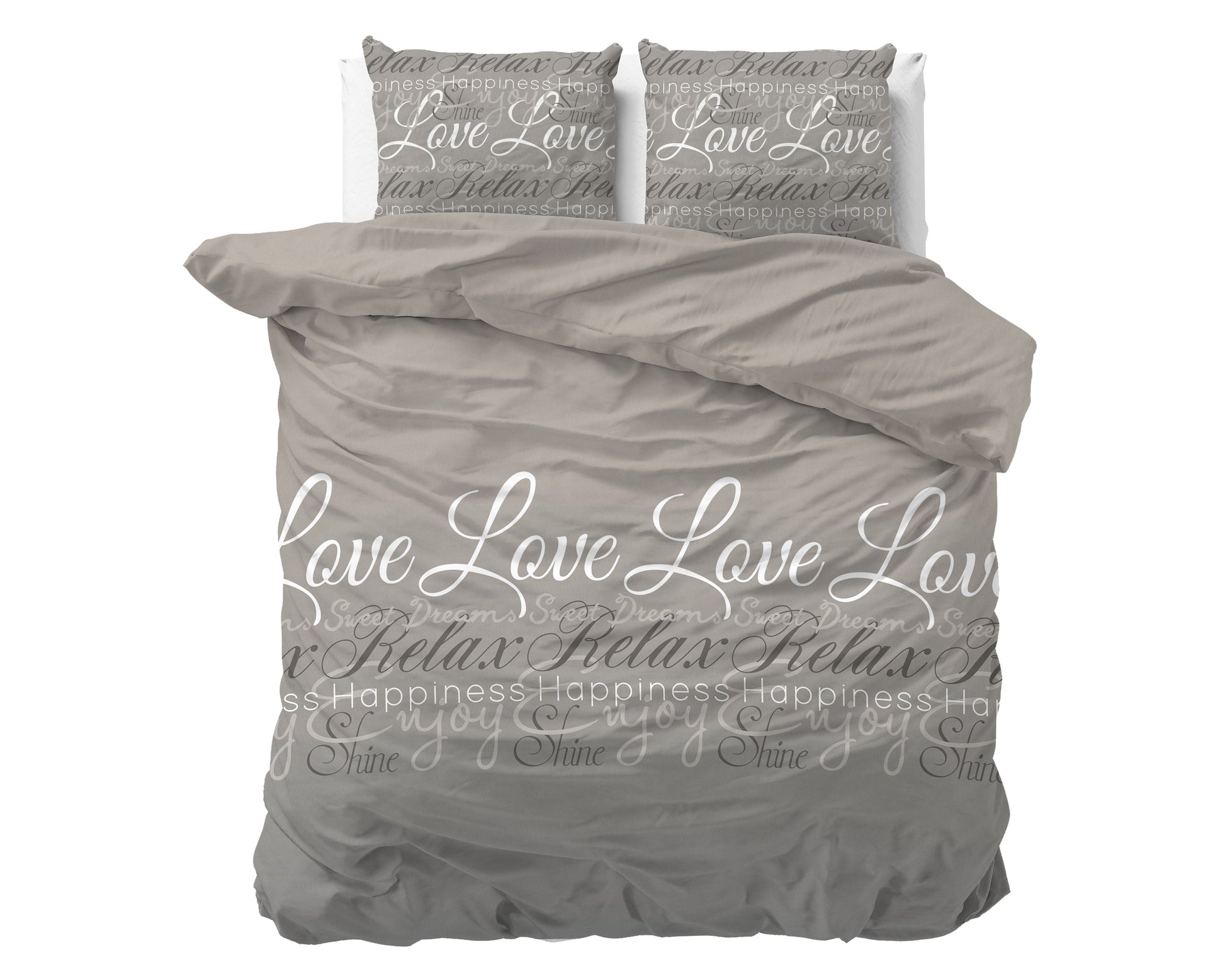 Na een lange en vermoeiende dag kun je in stijl onder dit Sleeptime Flanel Love and Relax-dekbedovertrek kruipen. Op dit overtrek staan woorden die allemaal verband houden met een goede nachtrust. Zo zie je de woorden "Love, relax, sweet dreams, shine, happiness" staan. De woorden komen duidelijk naar voren tegen de lichte achtergrond. Op het bijpassende kussensloop zie je dezelfde print weer terug. Het dekbedovertrek heeft een totale lengte van 220 cm en kan gemakkelijk aan de onderkant worden afgesloten met handige drukknopen.